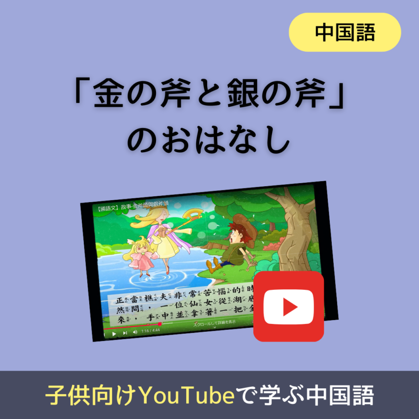 以前の記事では、中国語学習に使える台湾の子供向けYouTubeチャンネルをご紹介しました。その中のひとつ「幼兒天地」は、童話や動揺をポップなタッチで紹介するチャンネルです。今回は、「金の斧と銀の斧のお話」の動画について、セリフの日本語訳をまとめました。動画を見ながら参考にしてみてくださいね!